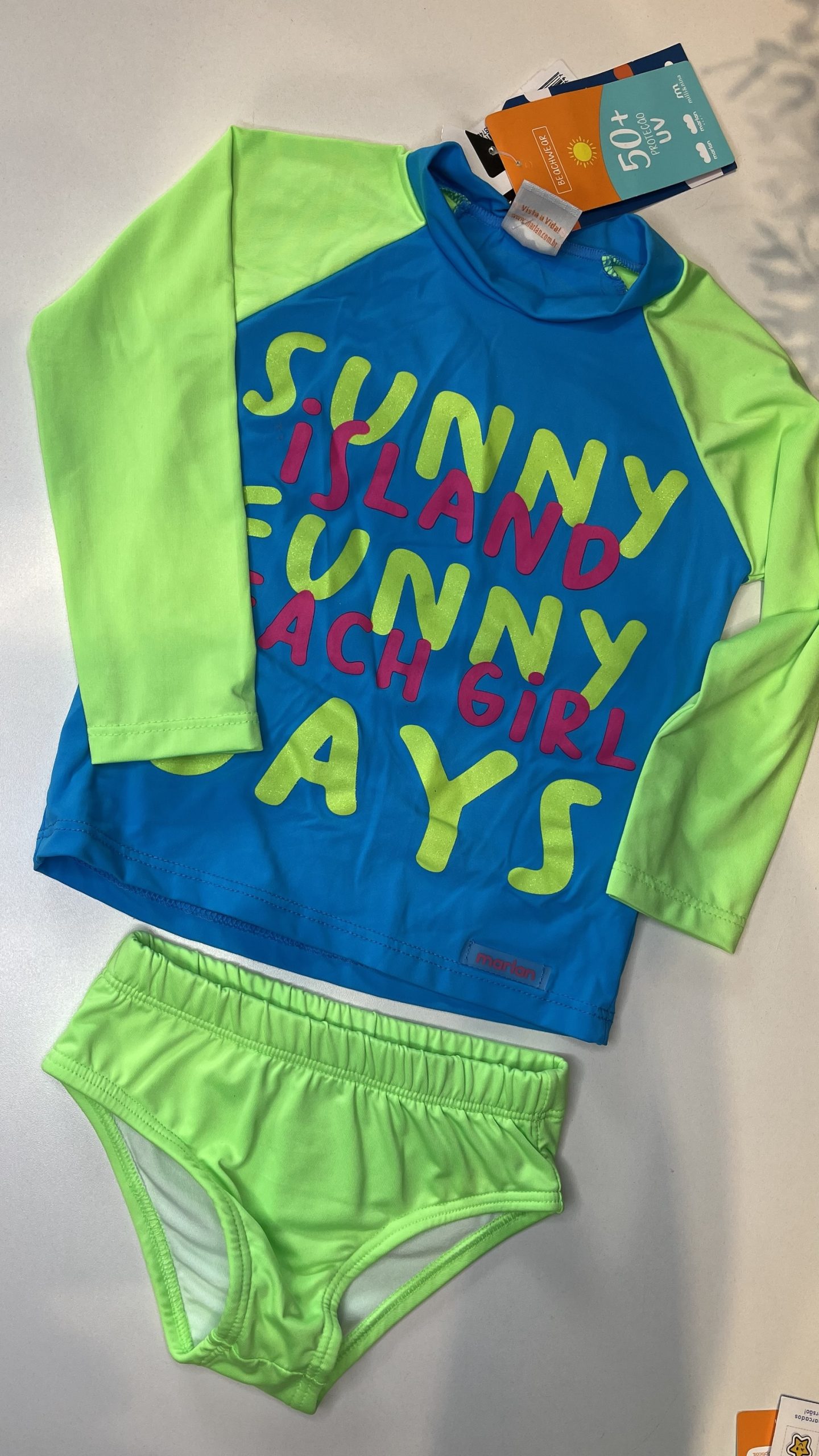 Produto desenvolvido com tecnologia UV+50 que oferece proteção solar para a criança.